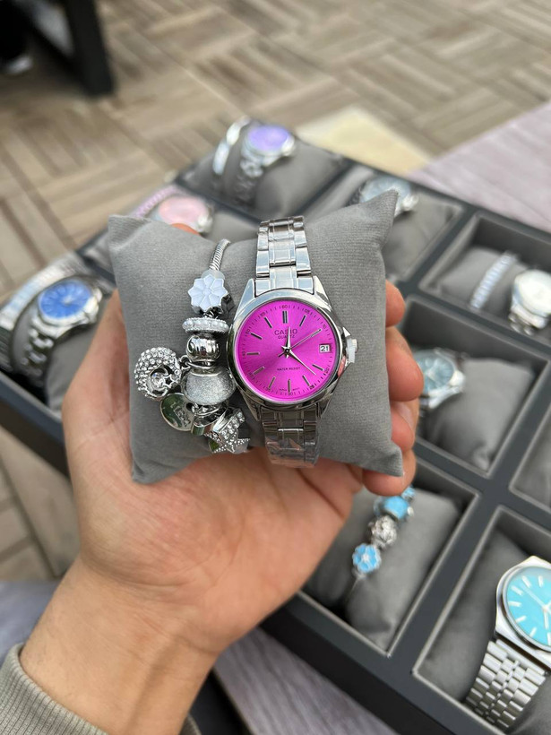 ساعت زنانه کاسیو خطی جدید بارنگ ثابت دارای تقویم روز شمار، شیشه تراش خرده وضد خش باتنوع رنگی بالا و جذاب،