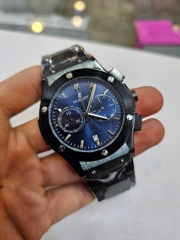 ساعت مردانه جدید هابلوت بارنگ ثابت صددرصد بند تمام استیل، در چند رنگ جذاب، شیشه تراش خرده وضد خش وباطری اصلی، عمر باطری یک سال، کیفیت عالی و قیمت مناسب همراه با جعبه وبالشتک شیک هدیه فروشگاه چیچیکالا،