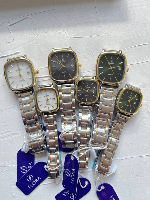 ساعت ست زنانه ومردانه جدید با برند فلورا بارنگ ثابت دارای تاریخ روز شمار شیشه تراش خرده وضد خش عمر باطری یک سال باکیفیت عالی وقیمت مناسب همراه با جعبه وبالشتک شیک هدیه فروشگاه چیچیکالا